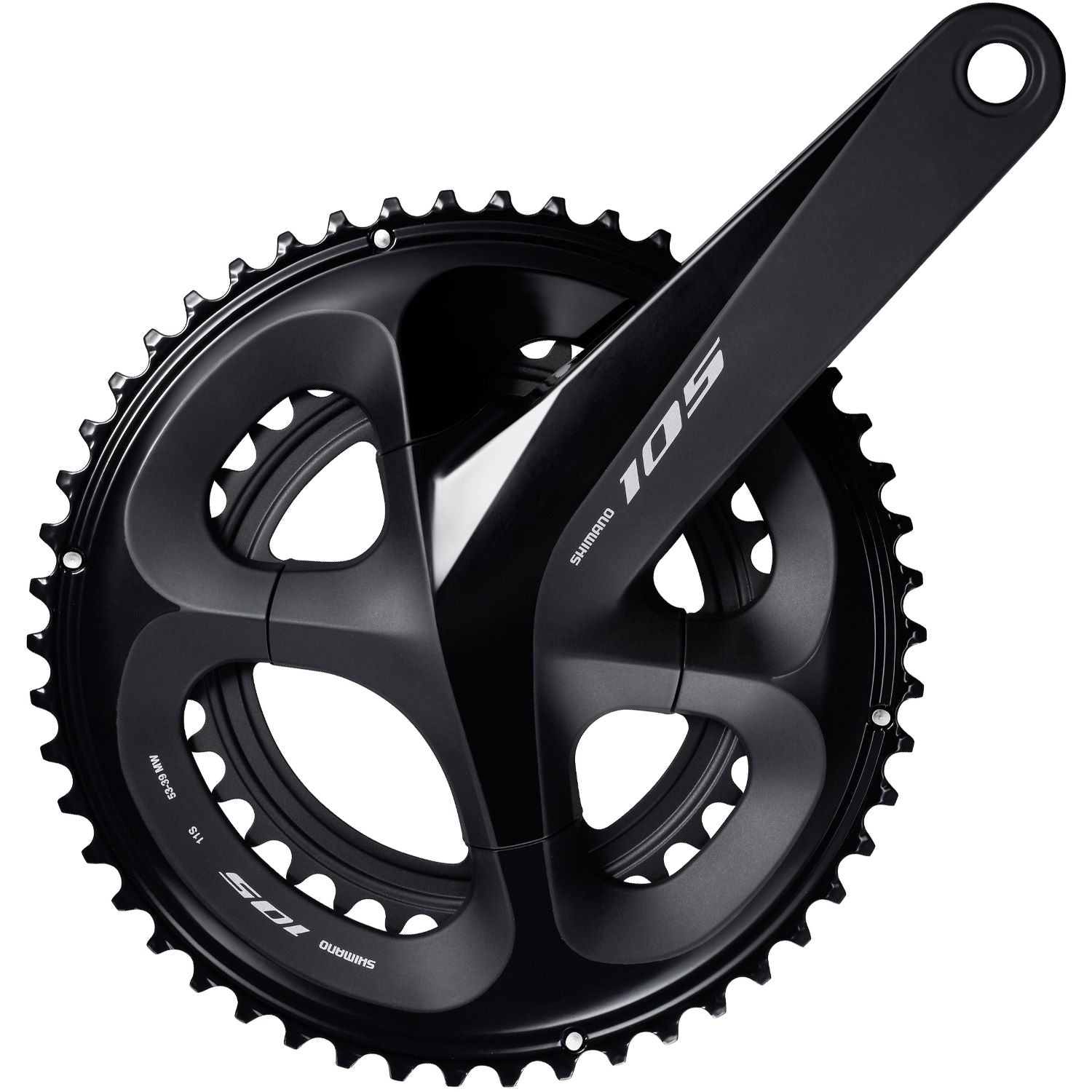 The redesigned SHIMANO 105 FC-R7000 crank balances weight and efficiency without sacrificing stiffness. Its wider gear pitch increases clearance with small gearings on modern 135mm O.L.D. frames. It is offered in 53-39, 52-36, and 50-34T chainring options and 160, 165, 170, 172.5, and 175mm crank arm lengths. Silky Black and Spark Silver color options are available